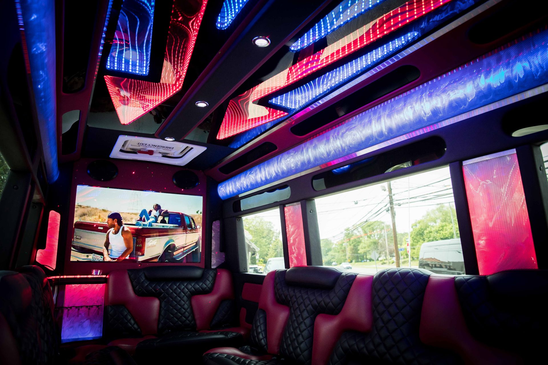 With its elegant lighting system, powerful sound setup, and fully stocked on-board mini-bars, it effortlessly morphs into the ideal vehicle for maintaining the festive spirit. The interior design displays a contemporary aesthetic, featuring a tasteful palette of sleek black and cool grey. To further enrich your voyage, a large-screen TV is available for personalized onboard entertainment, ensuring a truly bespoke experience for all passengers.