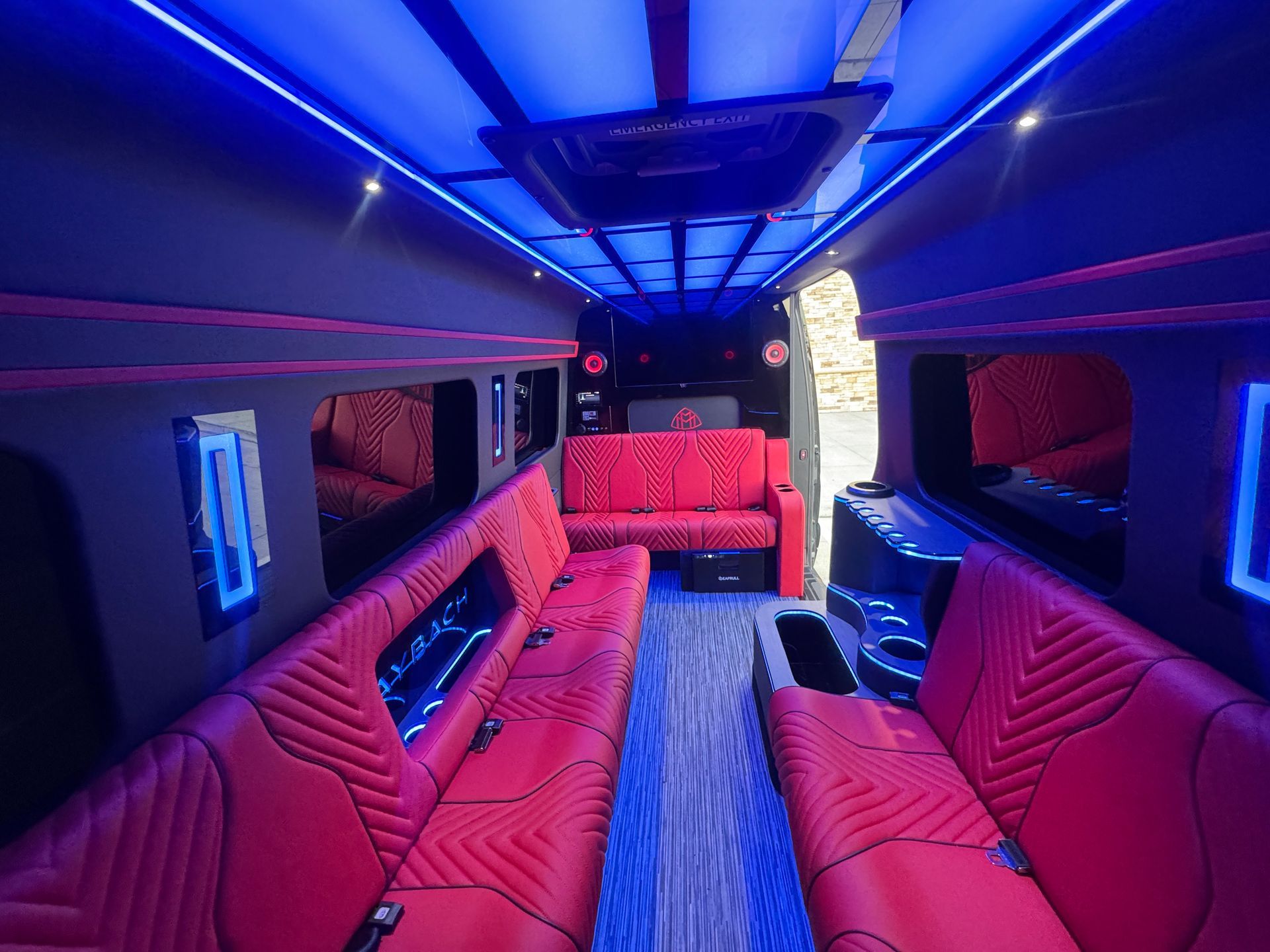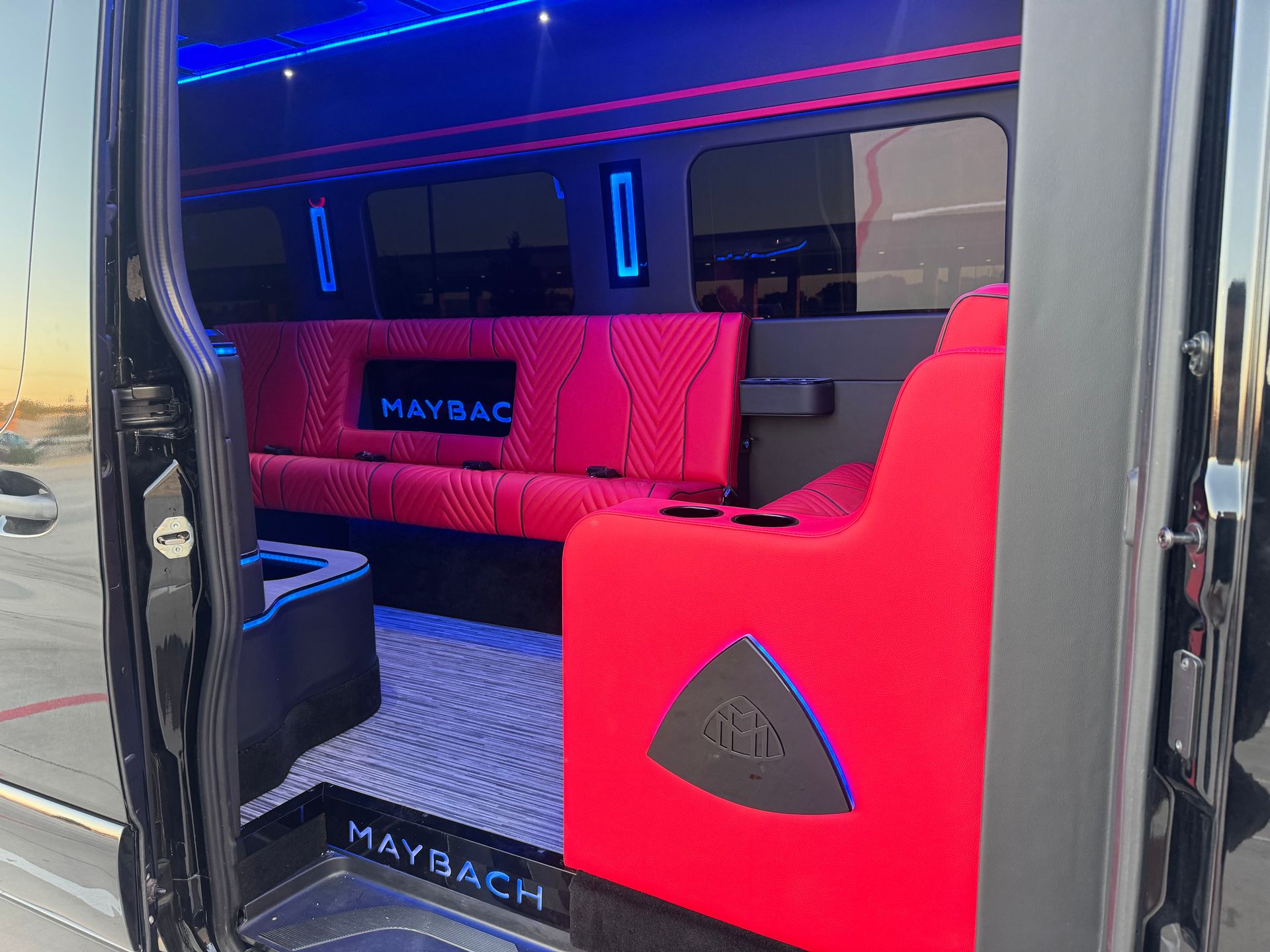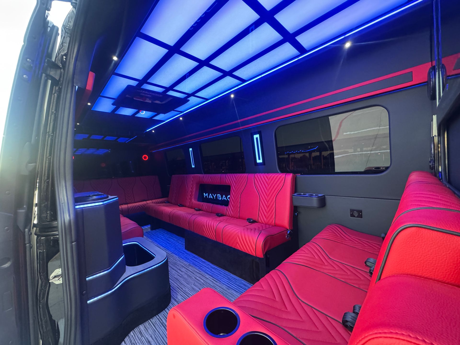 Designed to impress, the 2026 Mercedes Sprinter Maybach Party Bus features a bold black exterior that sets the tone for an elevated experience from the moment you pull up. Step inside to discover a stunning black and red interior that blends upscale comfort with modern nightlife energy. Plush Maybach seating, premium sound and lighting systems, and spacious room for your group make it the perfect choice for birthdays, bachelor and bachelorette parties, proms, and nights out on the town. This is more than transportation—it's a party atmosphere on wheels, crafted to keep the good times going from pickup to drop-off.